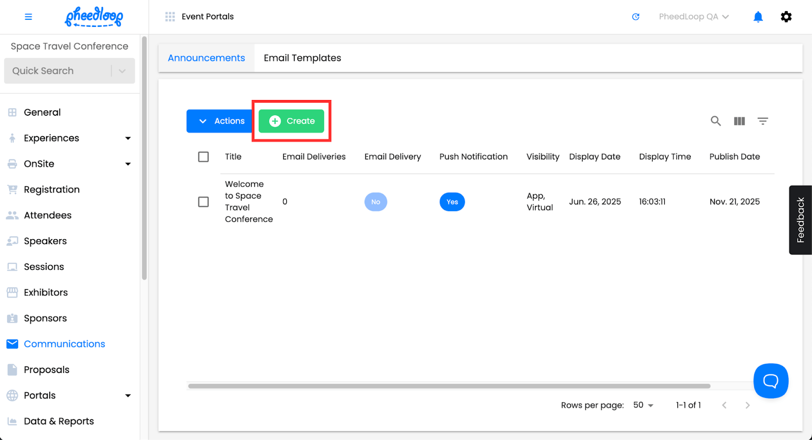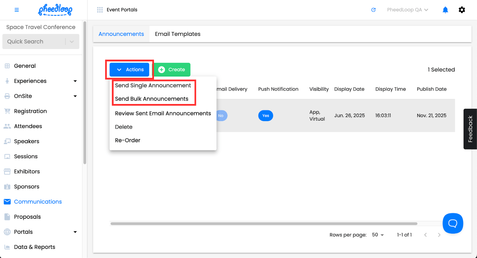 Select the announcement and choose Actions > Send Single Announcement for one attendee or Send Bulk Announcements for all attendees