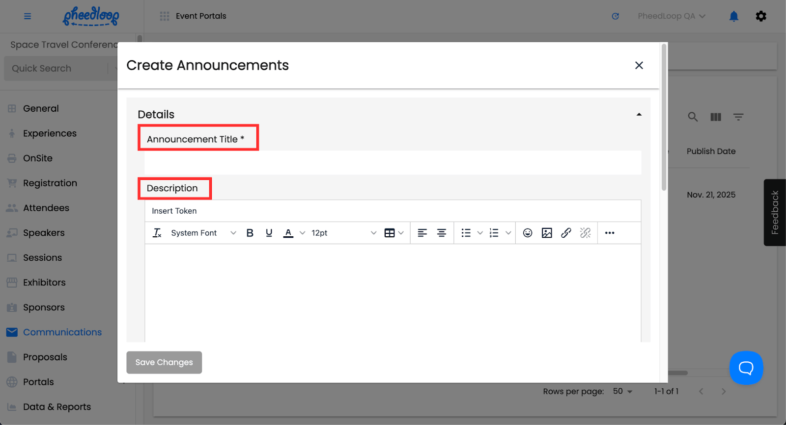 Under the Announcement Title and Description field, enter the title and contents for your email
