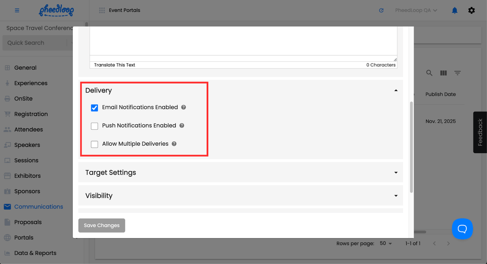 - Under Delivery, toggle on the Email Notifications Enabled or Push Notifications Enabled checkbox depending on whether your event is in-person or virtual