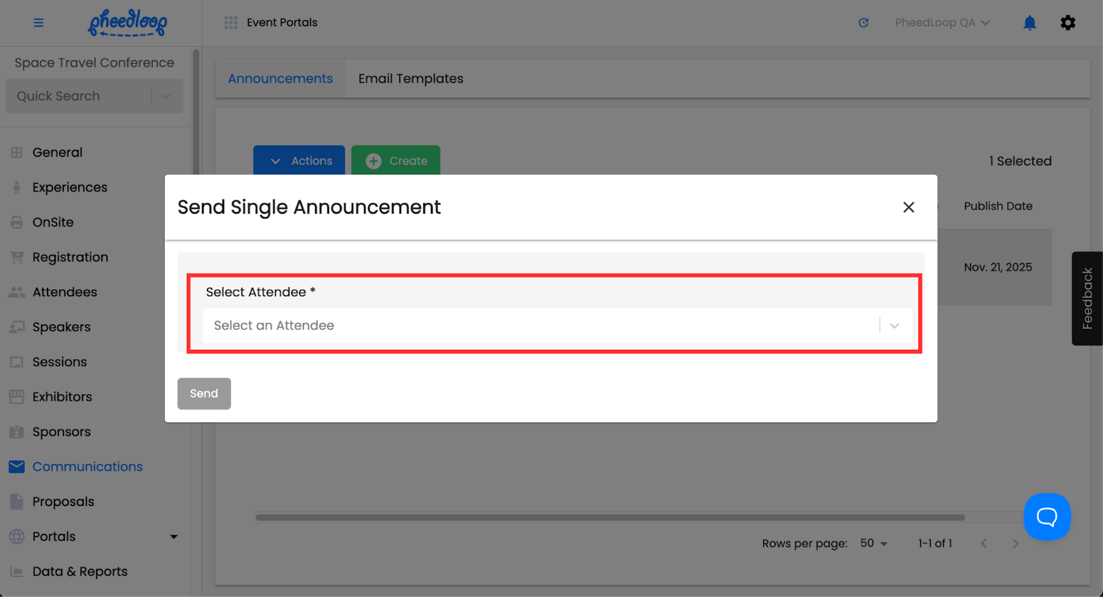 If you chose Send Single Announcement, select the attendee you wish to deliver the announcement to under the Select Attendee field, and select Send to deliver the announcement