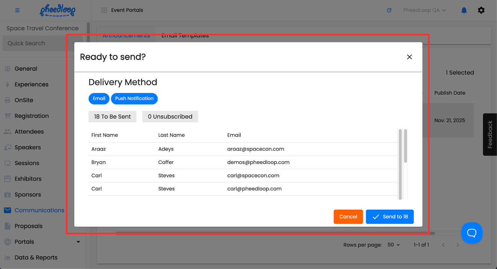 If you chose Send Bulk Announcements, review the attendees the email will be sent to and select Send to