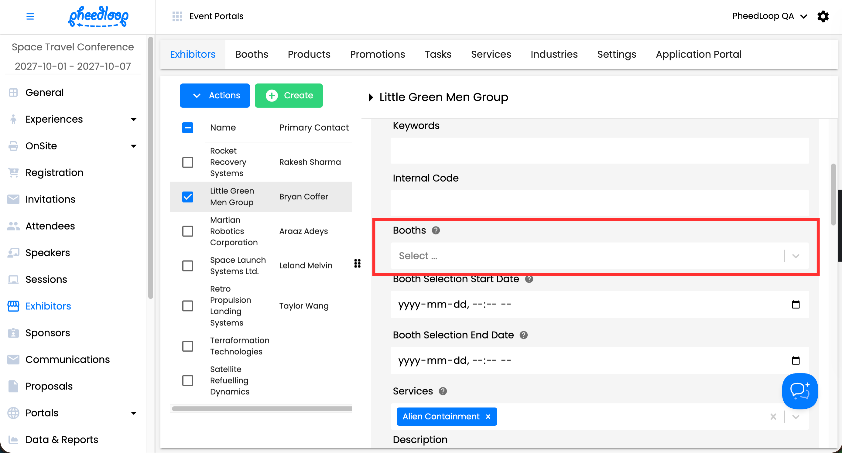- Under the Booths field, select the booths to be assigned to the exhibitor