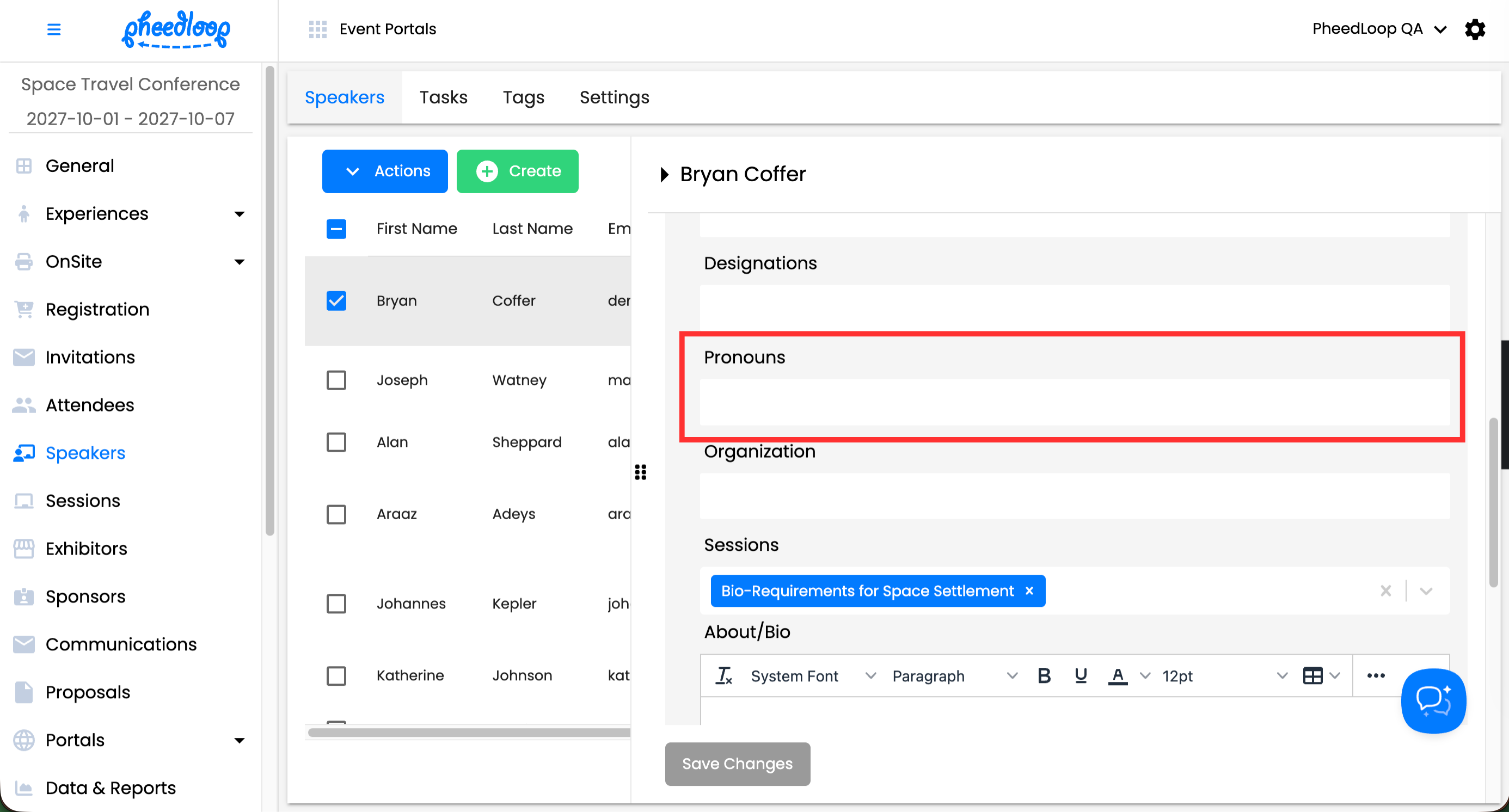 Event Administrators can assign pronouns to Speakers manually from the Event Dashboard.