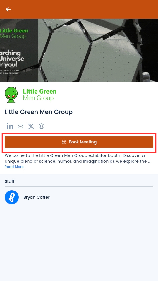 Some exhibitors may wish to opt out of meeting booking, while others may want to utilize the feature fully. To support both preferences, PheedLoop offers a dedicated setting called Meeting Booking Enabled to control which exhibitors will have meeting booking displayed. If disabled, the Exhibitor will not have the 'Request Meeting Booking' button visible on the Exhibitors page in the Event App.