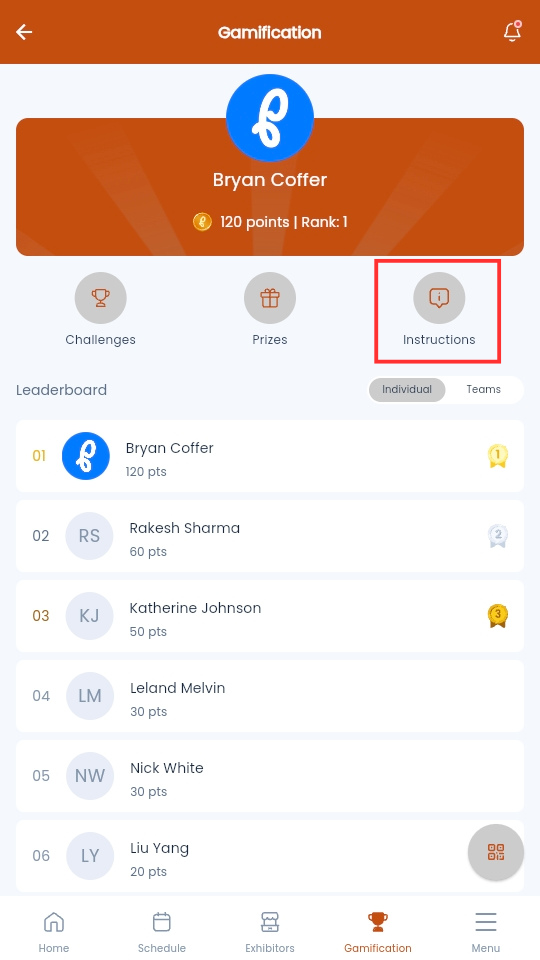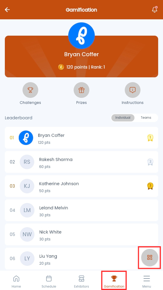 You have the power to create gamification codes within the platform and strategically hide them throughout your in-person event. Attendees can then discover and redeem these codes to earn points!