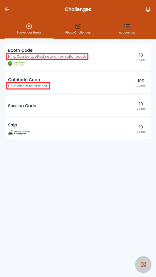 Clues are a great way to point attendees in the right direction for codes. Consider adding a booth name or to increase attendee interest in your booths or any other location you wish attendees to pay attention to.
